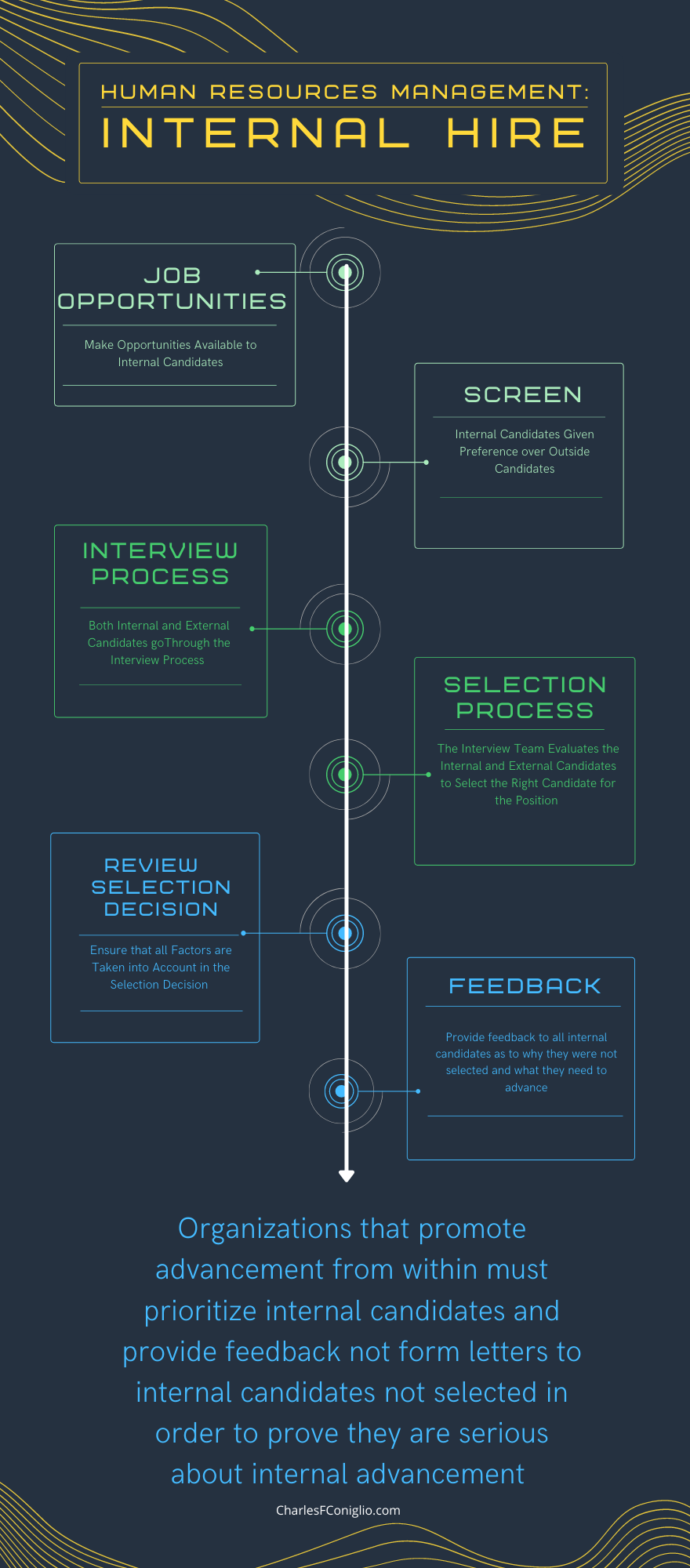 When people choose your organization, they expect that you will follow through with your promises. If your organization emphasizes internal mobility and you do not follow through, the psychological contract is broken. A psychological contract is an informal contract between the employer and the employee. The employer hires the employee and expects the employee to perform their job per their advertised skill set. The employee expects the employer to provide all the benefits they advertised through the entire hiring process. When this contract is broken, the result is often a disillusioned employee or an unsatisfied employer. A disillusioned employee will look for another organization. I offer the following process to ensure that your internal hiring process proves that you are serious about promoting opportunities from within.